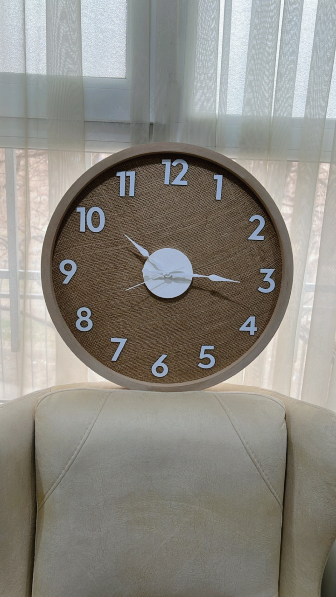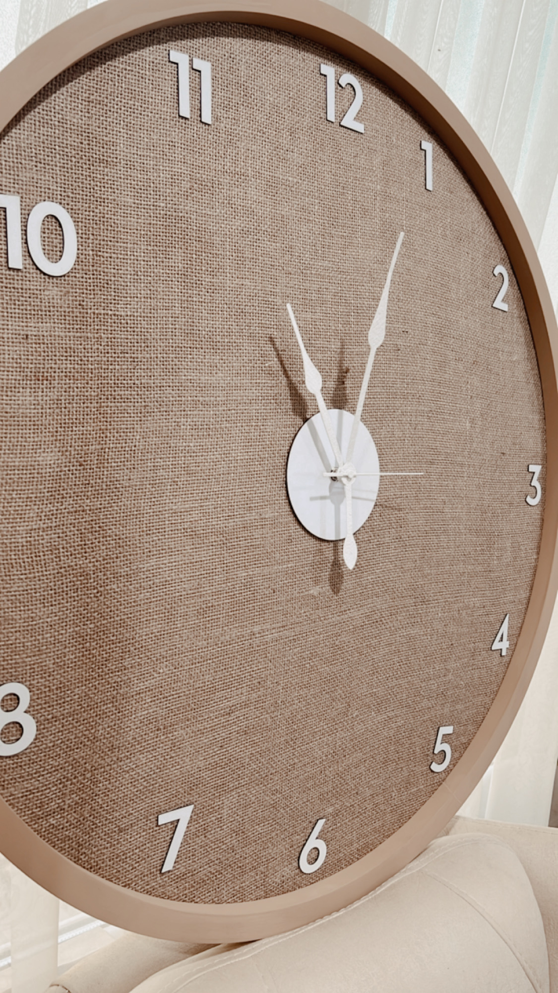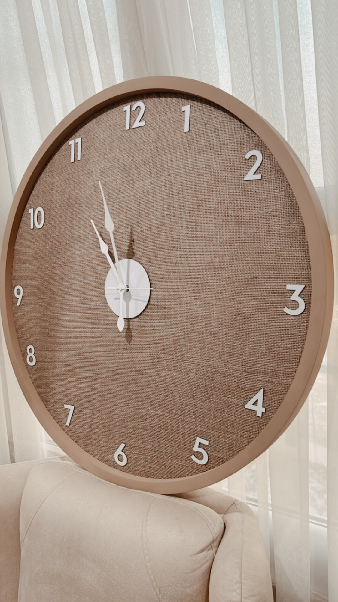 ساعت دیواری مدل کنفی | زمینه پارچه کنفی طبیعی با اعداد برجسته سفید